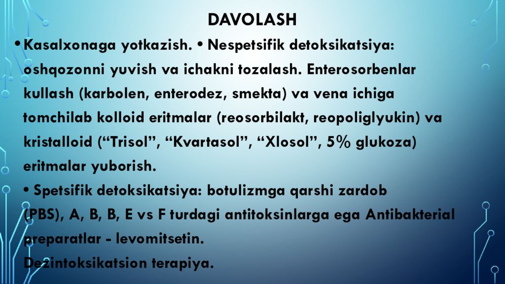 Kasalxonaga yotkazish. • Nespetsifik detoksikatsiya : oshqozonni yuvish va ichakni tozalash. Enterosorbenlar kullash ( karbolen, enterodez, smekta ) va vena ichiga tomchilab kolloid eritmalar ( reosorbilakt, reopoliglyukin ) va kristalloid (“ Trisol ”, “ Kvartasol ”, “ Xlosol ”, 5% glukoza) eritmalar yuborish. • Spetsifik detoksikatsiya : botulizmga qarshi zardob (PBS), A, B, B, E vs F turdagi antitoksinlarga ega Antibakterial preparatlar - levomitsetin. Dezintoksikatsion terapiya.