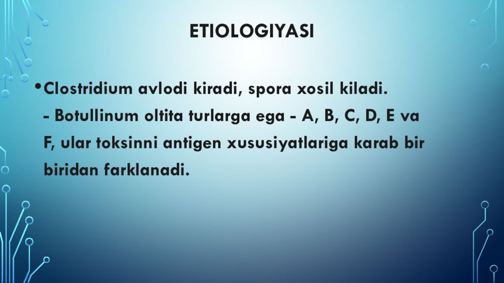 Clostridium avlodi kiradi, spora xosil kiladi. - Botullinum oltita turlarga ega - A, B, C, D, E va F, ular toksinni antigen xususiyatlariga karab bir biridan farklanadi.