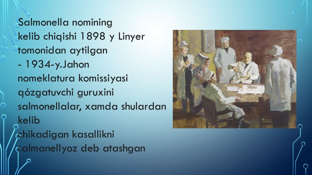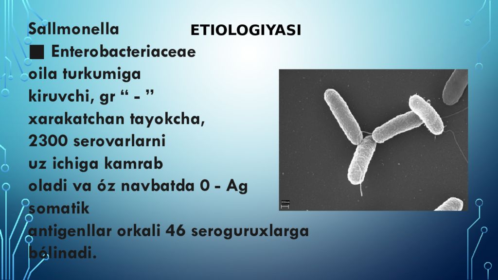 Sallmonella ■ Enterobacteriaceae oila turkumiga kiruvchi, gr “ - ” xarakatchan tayokcha, 2300 serovarlarni uz ichiga kamrab oladi va óz navbatda 0 - Ag somatik antigenllar orkali 46 seroguruxlarga bólinadi.