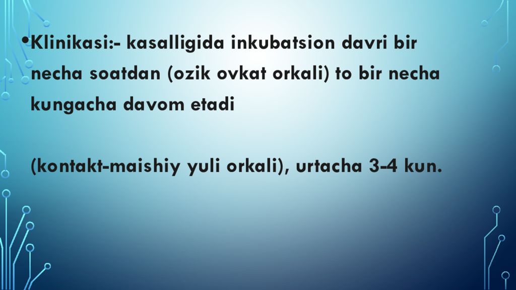 Klinikasi:- kasalligida inkubatsion davri bir necha soatdan ( ozik ovkat orkali ) to bir necha kungacha davom etadi (kontakt- maishiy yuli orkali ), urtacha 3-4 kun.