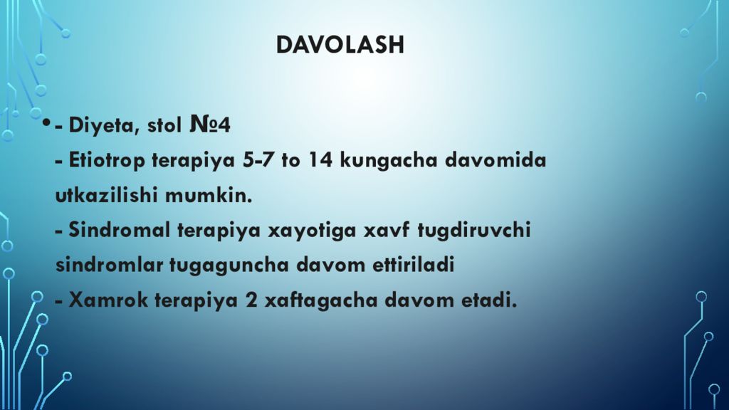- Diyeta, stol №4 - Etiotrop terapiya 5-7 to 14 kungacha davomida utkazilishi mumkin. - Sindromal terapiya xayotiga xavf tugdiruvchi sindromlar tugaguncha davom ettiriladi - Xamrok terapiya 2 xaftagacha davom etadi.