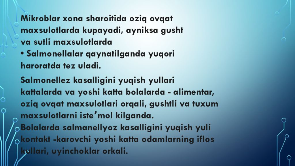 Mikroblar xona sharoitida oziq ovqat maxsulotlarda kupayadi, ayniksa gusht va sutli maxsulotlarda • Salmonellalar qaynatilganda yuqori haroratda tez uladi. Salmonellez kasalligini yuqish yullari kattalarda va yoshi katta bolalarda - alimentar, oziq ovqat maxsulotlari orqali, gushtli va tuxum maxsulotlarni isteʼmol kilganda. Bolalarda salmanellyoz kasalligini yuqish yuli kontakt - karovchi yoshi katta odamlarning iflos kullari, uyinchoklar orkali.