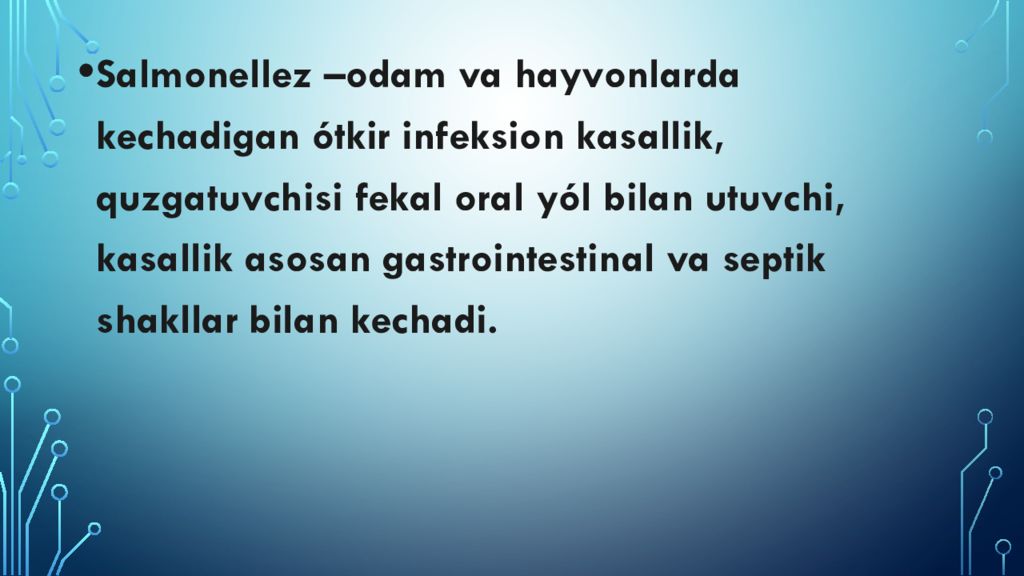 Salmonellez –odam va hayvonlarda kechadigan ótkir infeksion kasallik, quzgatuvchisi fekal oral yól bilan utuvchi, kasallik asosan gastrointestinal va septik shakllar bilan kechadi.