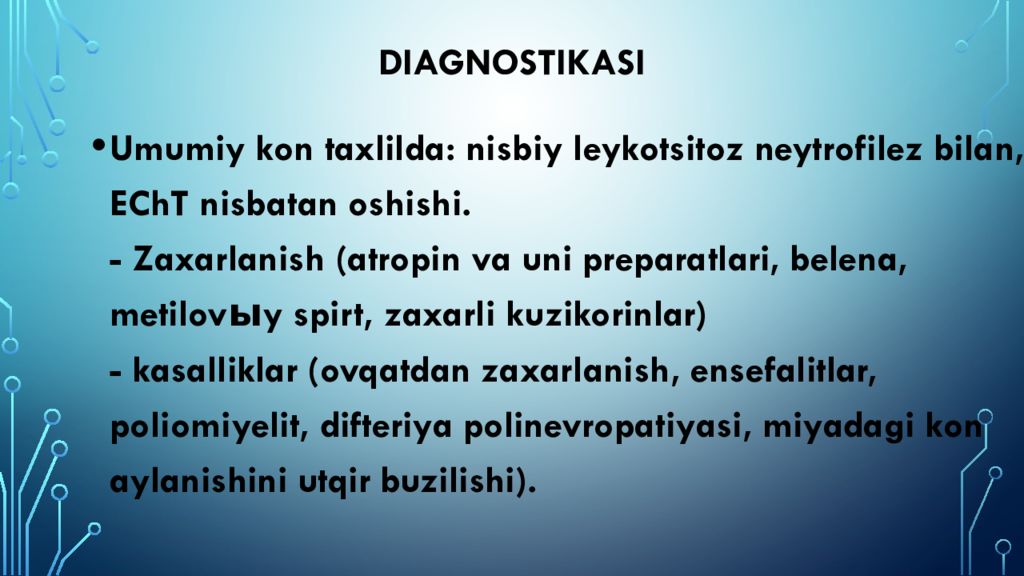 Umumiy kon taxlilda: nisbiy leykotsitoz neytrofilez bilan, EChT nisbatan oshishi. - Zaxarlanish (atropin va uni preparatlari, belena, metilov ы y spirt, zaxarli kuzikorinlar) - kasalliklar (ovqatdan zaxarlanish, ensefalitlar, poliomiyelit, difteriya polinevropatiyasi, miyadagi kon aylanishini utqir buzilishi).