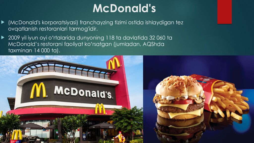 (McDonald's korporatsiyasi) franchayzing tizimi ostida ishlaydigan tez ovqatlanish restoranlari tarmog'idir. 2009 yil iyun oyi oʻrtalarida dunyoning 118 ta davlatida 32 060 ta McDonald’s restorani faoliyat koʻrsatgan (jumladan, AQShda taxminan 14 000 ta).