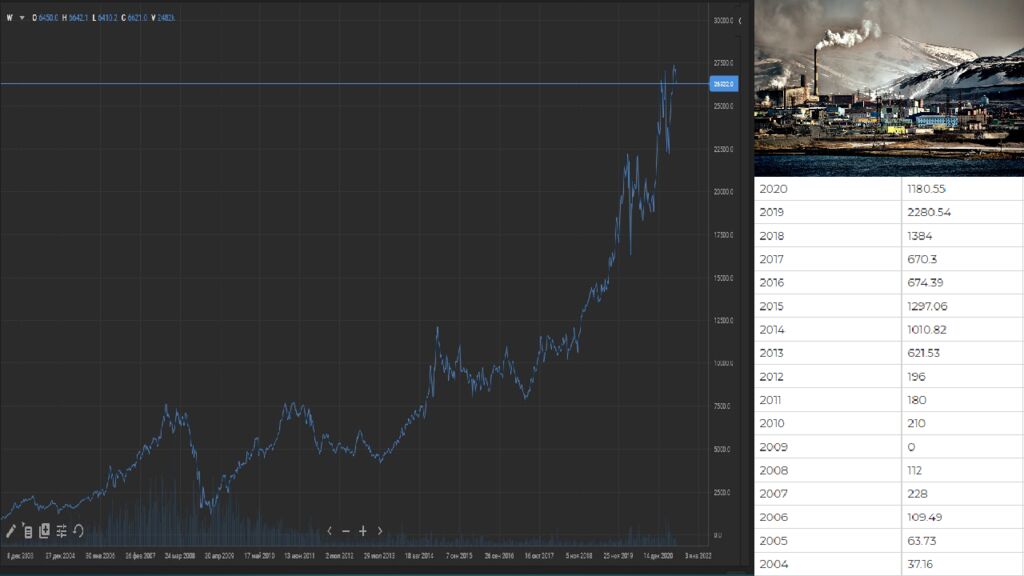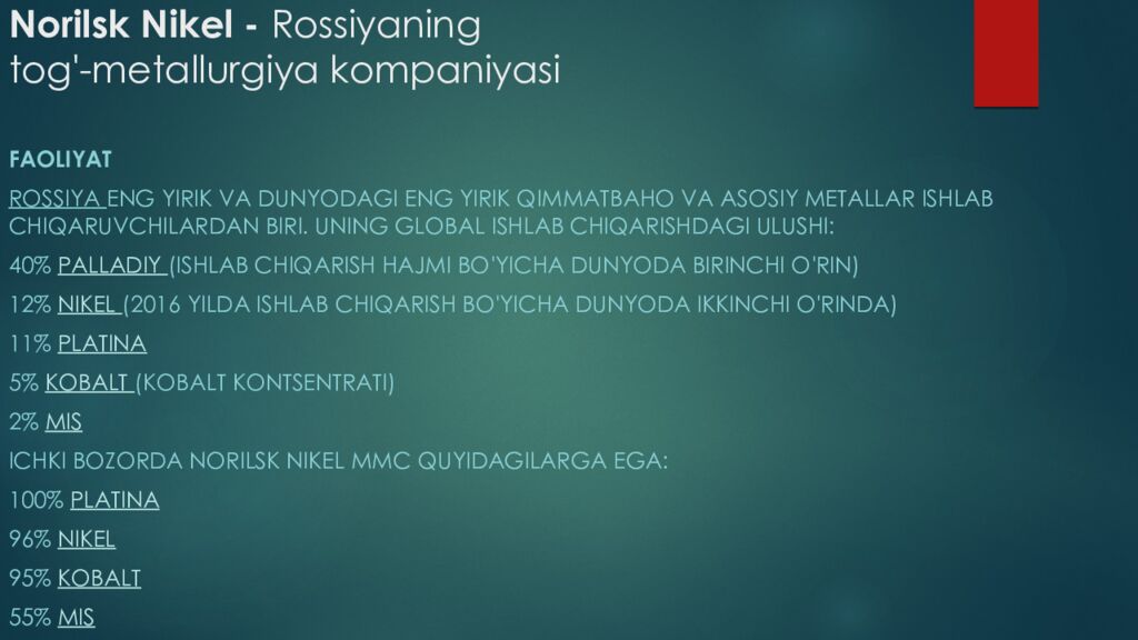 Faoliyat Rossiya eng yirik va dunyodagi eng yirik qimmatbaho va asosiy metallar ishlab chiqaruvchilardan biri. Uning global ishlab chiqarishdagi ulushi: 40% palladiy (ishlab chiqarish hajmi bo'yicha dunyoda birinchi o'rin) 12% nikel (2016 yilda ishlab chiqarish bo'yicha dunyoda ikkinchi o'rinda) 11% platina 5% kobalt (kobalt kontsentrati) 2% mis Ichki bozorda Norilsk Nikel MMC quyidagilarga ega: 100% platina 96% nikel 95% kobalt 55% mis