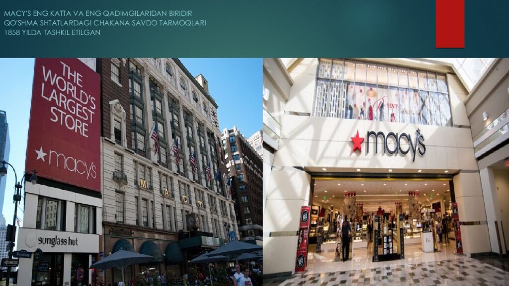 Macy's eng katta va eng qadimgilaridan biridir Qo'shma Shtatlardagi chakana savdo tarmoqlari 1858 yilda tashkil etilgan