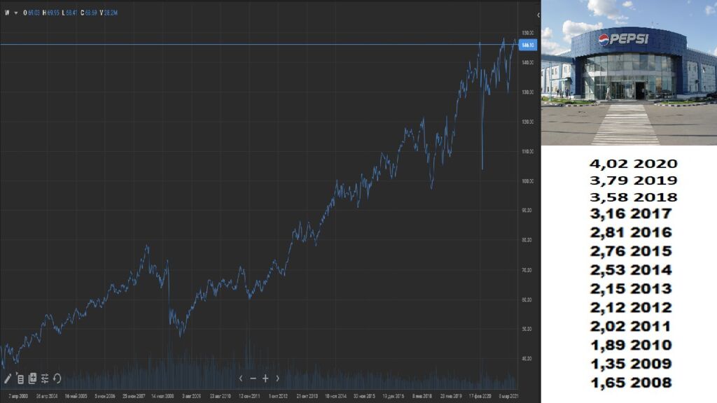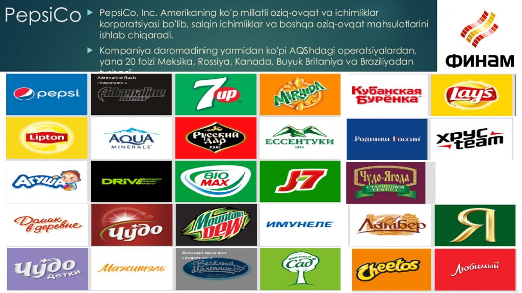 PepsiCo, Inc. Amerikaning ko'p millatli oziq-ovqat va ichimliklar korporatsiyasi bo'lib, salqin ichimliklar va boshqa oziq-ovqat mahsulotlarini ishlab chiqaradi. Kompaniya daromadining yarmidan ko'pi AQShdagi operatsiyalardan, yana 20 foizi Meksika, Rossiya, Kanada, Buyuk Britaniya va Braziliyadan tushadi.