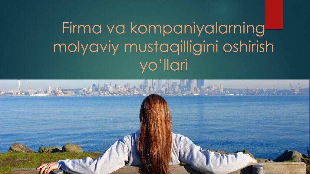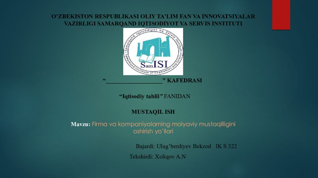 O’ZBEKISTON RESPUBLIKASI OLIY TA’LIM FAN VA INNOVATSIYALAR VAZIRLIGI SAMARQAND IQTISODIYOT VA SERVIS INSTITUTI “___________________” KAFEDRASI “ Iqtisodiy tahlil ” FANIDAN MUSTAQIL ISH Mavzu : Firma va kompaniyalarning molyaviy mustaqilligini oshirish yo’llari Bajardi : Ulug’berdiyev Bekzod IK S 322 Tekshirdi : Xoliqov A.N