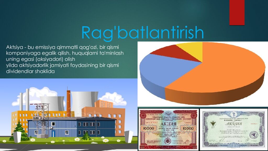 Aktsiya - bu emissiya qimmatli qog'ozi, bir qismi kompaniyaga egalik qilish, huquqlarni ta'minlash uning egasi (aksiyadori) olish yilda aktsiyadorlik jamiyati foydasining bir qismi dividendlar shaklida