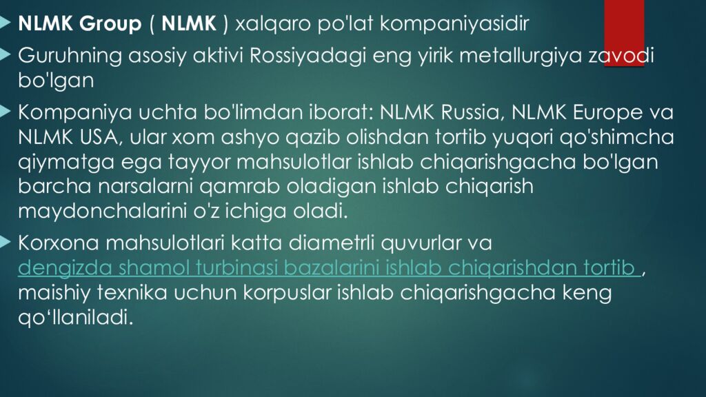 NLMK Group ( NLMK ) xalqaro po'lat kompaniyasidir Guruhning asosiy aktivi Rossiyadagi eng yirik metallurgiya zavodi bo'lgan Kompaniya uchta bo'limdan iborat: NLMK Russia, NLMK Europe va NLMK USA, ular xom ashyo qazib olishdan tortib yuqori qo'shimcha qiymatga ega tayyor mahsulotlar ishlab chiqarishgacha bo'lgan barcha narsalarni qamrab oladigan ishlab chiqarish maydonchalarini o'z ichiga oladi. Korxona mahsulotlari katta diametrli quvurlar va dengizda shamol turbinasi bazalarini ishlab chiqarishdan tortib, maishiy texnika uchun korpuslar ishlab chiqarishgacha keng qo‘llaniladi.