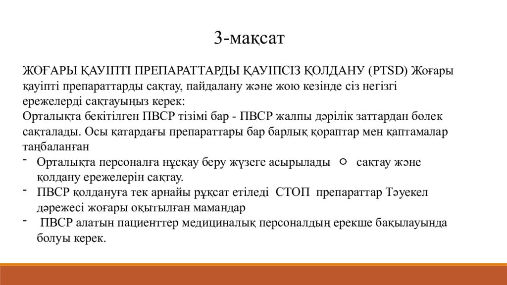 3- мақса т ЖОҒАРЫ ҚАУІПТІ ПРЕПАРАТТАРДЫ ҚАУІПСІЗ ҚОЛДАНУ ( PTSD) Жоғары қауіпті препараттарды сақтау, пайдалану және жою кезінде сіз негізгі ережелерді сақтауыңыз керек : Орталықта бекітілген ПВСР тізімі бар - ПВСР жалпы дәрілік заттардан бөлек сақталады. Осы қатардағы препараттары бар барлық қораптар мен қаптамалар таңбаланған Орталықта персоналға нұсқау беру жүзеге асырылады ㅇ сақтау және қолдану ережелерін сақтау. ПВСР қолдануға тек арнайы рұқсат етіледі СТОП препараттар Тәуекел дәрежесі жоғары оқытылған мамандар ПВСР алатын пациенттер медициналық персоналдың ерекше бақылауында болуы керек.