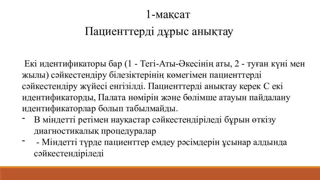 П ациенттерді дұрыс анықтау 1- мақса т Е кі идентификаторы бар (1 - Тегі-Аты-Әкесінің аты, 2 - туған күні мен жылы ) сәйкестендіру білезіктерінің көмегімен пациенттерді сәйкестендіру жүйесі енгізілді. Пациенттерді анықтау керек C екі идентификаторды, Палата нөмірін және бөлімше атауын пайдалану идентификаторлар болып табылмайды. B міндетті ретімен науқастар сәйкестендіріледі бұрын өткізу диагностикалық процедуралар - Міндетті түрде пациенттер емдеу рәсімдерін ұсынар алдында сәйкестендіріледі