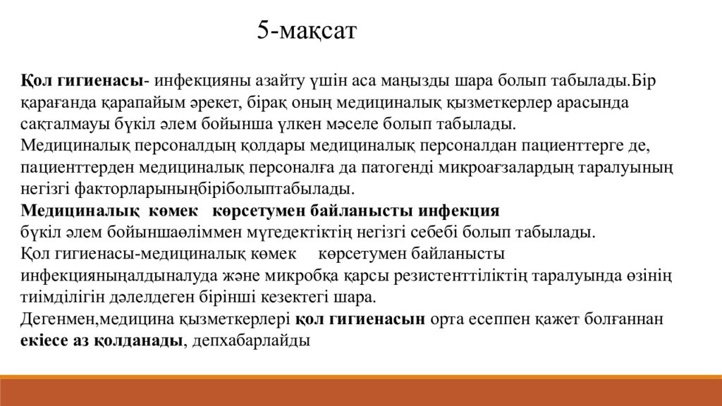 Қол гигиенасы - инфекцияны азайту үшін аса маңызды шара болып табылады.Бір қарағанда қарапайым әрекет, бірақ оның медициналық қызметкерлер арасында сақталмауы бүкіл әлем бойынша үлкен мәселе болып табылады. Медициналық персоналдың қолдары медициналық персоналдан пациенттерге де, пациенттерден медициналық персоналға да патогенді микроағзалардың таралуының негізгі факторларыныңбіріболыптабылады. Медициналық көмек көрсетумен байланысты инфекция бүкіл әлем бойыншаөліммен мүгедектіктің негізгі себебі болып табылады. Қол гигиенасы-медициналық көмек көрсетумен байланысты инфекцияныңалдыналуда және микробқа қарсы резистенттіліктің таралуында өзінің тиімділігін дәлелдеген бірінші кезектегі шара. Дегенмен,медицина қызметкерлері қол гигиенасын орта есеппен қажет болғаннан екіесе аз қолданады, депхабарлайды 5- мақса т