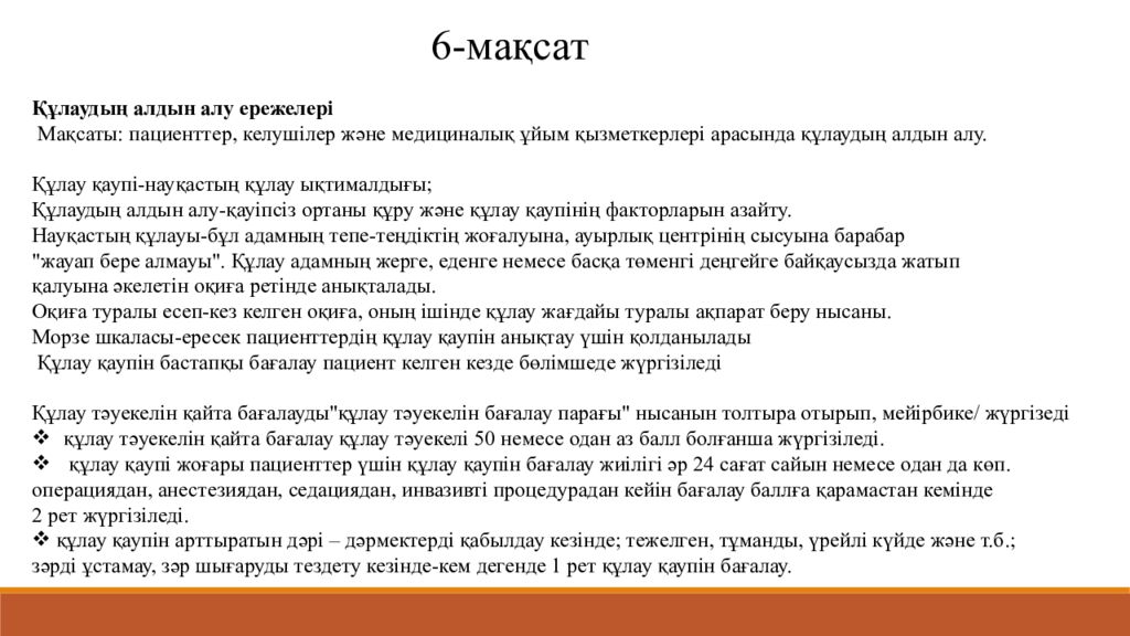 Құлаудың алдын алу ережелері Мақсаты: пациенттер, келушілер және медициналық ұйым қызметкерлері арасында құлаудың алдын алу. Құлау қаупі-науқастың құлау ықтималдығы; Құлаудың алдын алу-қауіпсіз ортаны құру және құлау қаупінің факторларын азайту. Науқастың құлауы-бұл адамның тепе-теңдіктің жоғалуына, ауырлық центрінің сысуына барабар "жауап бере алмауы". Құлау адамның жерге, еденге немесе басқа төменгі деңгейге байқаусызда жатып қалуына әкелетін оқиға ретінде анықталады. Оқиға туралы есеп-кез келген оқиға, оның ішінде құлау жағдайы туралы ақпарат беру нысаны. Морзе шкаласы-ересек пациенттердің құлау қаупін анықтау үшін қолданылады Құлау қаупін бастапқы бағалау пациент келген кезде бөлімшеде жүргізіледі Құлау тәуекелін қайта бағалауды"құлау тәуекелін бағалау парағы" нысанын толтыра отырып, мейірбике/ жүргізеді құлау тәуекелін қайта бағалау құлау тәуекелі 50 немесе одан аз балл болғанша жүргізіледі. құлау қаупі жоғары пациенттер үшін құлау қаупін бағалау жиілігі әр 24 сағат сайын немесе одан да көп. операциядан, анестезиядан, седациядан, инвазивті процедурадан кейін бағалау баллға қарамастан кемінде 2 рет жүргізіледі. құлау қаупін арттыратын дәрі – дәрмектерді қабылдау кезінде; тежелген, тұманды, үрейлі күйде және т.б.; зәрді ұстамау, зәр шығаруды тездету кезінде-кем дегенде 1 рет құлау қаупін бағалау. 6- мақса т