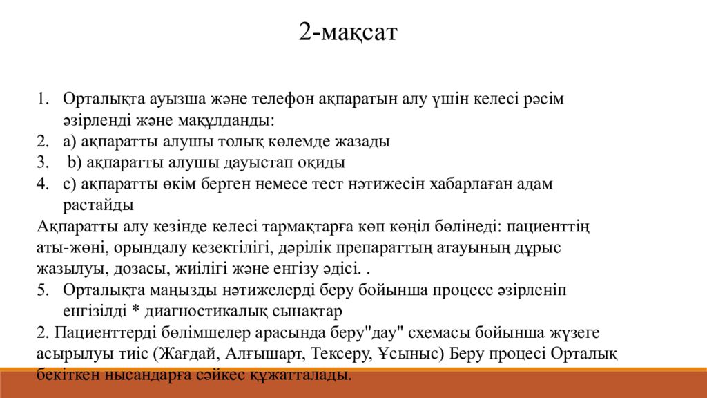 2- мақса т Орталықта ауызша және телефон ақпаратын алу үшін келесі рәсім әзірленді және мақұлданды : а) ақпаратты алушы толық көлемде жазады b) ақпаратты алушы дауыстап оқиды с) ақпаратты өкім берген немесе тест нәтижесін хабарлаған адам растайды Ақпаратты алу кезінде келесі тармақтарға көп көңіл бөлінеді : пациенттің аты-жөні, орындалу кезектілігі, дәрілік препараттың атауының дұрыс жазылуы, дозасы, жиілігі және енгізу әдісі.. Орталықта маңызды нәтижелерді беру бойынша процесс әзірленіп енгізілді * диагностикалық сынақтар 2. Пациенттерді бөлімшелер арасында беру"дау " схемасы бойынша жүзеге асырылуы тиіс ( Жағдай, Алғышарт, Тексеру, Ұсыныс ) Беру процесі Орталық бекіткен нысандарға сәйкес құжатталады.