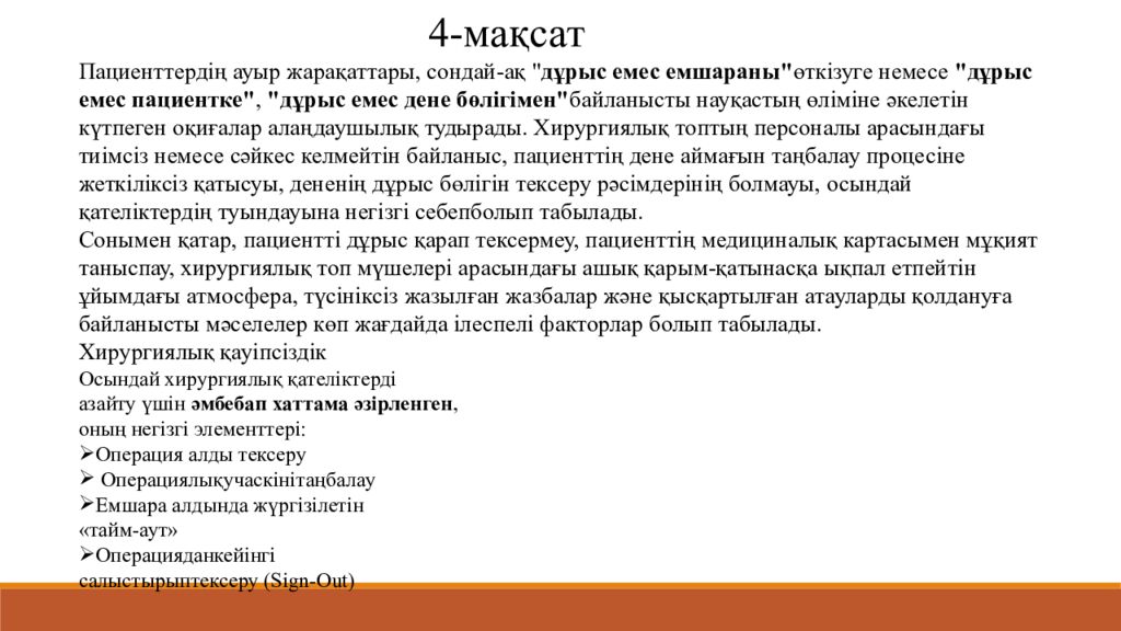 Пациенттердің ауыр жарақаттары, сондай-ақ " дұрыс емес емшараны" өткізуге немесе "дұрыс емес пациентке", "дұрыс емес дене бөлігімен" байланысты науқастың өліміне әкелетін күтпеген оқиғалар алаңдаушылық тудырады. Хирургиялық топтың персоналы арасындағы тиімсіз немесе сәйкес келмейтін байланыс, пациенттің дене аймағын таңбалау процесіне жеткіліксіз қатысуы, дененің дұрыс бөлігін тексеру рәсімдерінің болмауы, осындай қателіктердің туындауына негізгі себепболып табылады. Сонымен қатар, пациентті дұрыс қарап тексермеу, пациенттің медициналық картасымен мұқият таныспау, хирургиялық топ мүшелері арасындағы ашық қарым-қатынасқа ықпал етпейтін ұйымдағы атмосфера, түсініксіз жазылған жазбалар және қысқартылған атауларды қолдануға байланысты мәселелер көп жағдайда ілеспелі факторлар болып табылады. Хирургиялық қауіпсіздік Осындай хирургиялық қателіктерді азайту үшін әмбебап хаттама әзірленген, оның негізгі элементтері: Операция алды тексеру Операциялықучаскінітаңбалау Емшара алдында жүргізілетін «тайм-аут» Операцияданкейінгі салыстырыптексеру (Sign-Out) 4- мақса т
