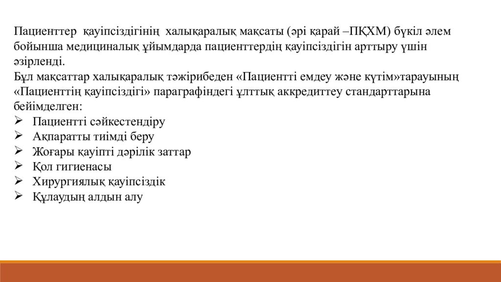 Пациенттер қауіпсіздігінің халықаралық мақсаты (әрі қарай –ПҚХМ) бүкіл әлем бойынша медициналық ұйымдарда пациенттердің қауіпсіздігін арттыру үшін әзірленді. Бұл мақсаттар халықаралық тәжірибеден «Пациентті емдеу және күтім»тарауының «Пациенттің қауіпсіздігі» параграфіндегі ұлттық аккредиттеу стандарттарына бейімделген: Пациентті сәйкестендіру Ақпаратты тиімді беру Жоғары қауіпті дәрілік заттар Қол гигиенасы Хирургиялық қауіпсіздік Құлаудың алдын алу