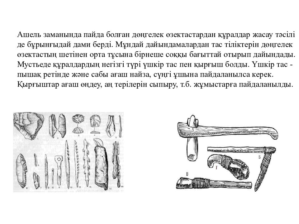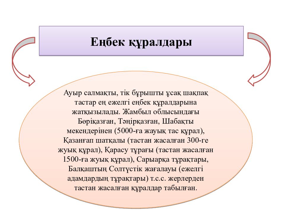 Еңбек құралдары Ауыр салмақты, тік бұрышты ұсақ шақпақ тастар ең ежелгі еңбек құралдарына жатқызылады. Жамбыл облысындағы Бөріқазған, Тәңірқазған, Шабақты мекендерінен (5000-ға жауық тас құрал ), Қазанғап шатқалы ( тастан жасалған 300-ге жуық құрал ), Қарасу тұрағы ( тастан жасалған 1500-ға жуық құрал ), Сарыарқа тұрақтары, Балқаштың Солтүстік жағалауы ( ежелгі адамдардың тұрақтары ) т.с.с. жерлерден тастан жасалған құралдар табылған.