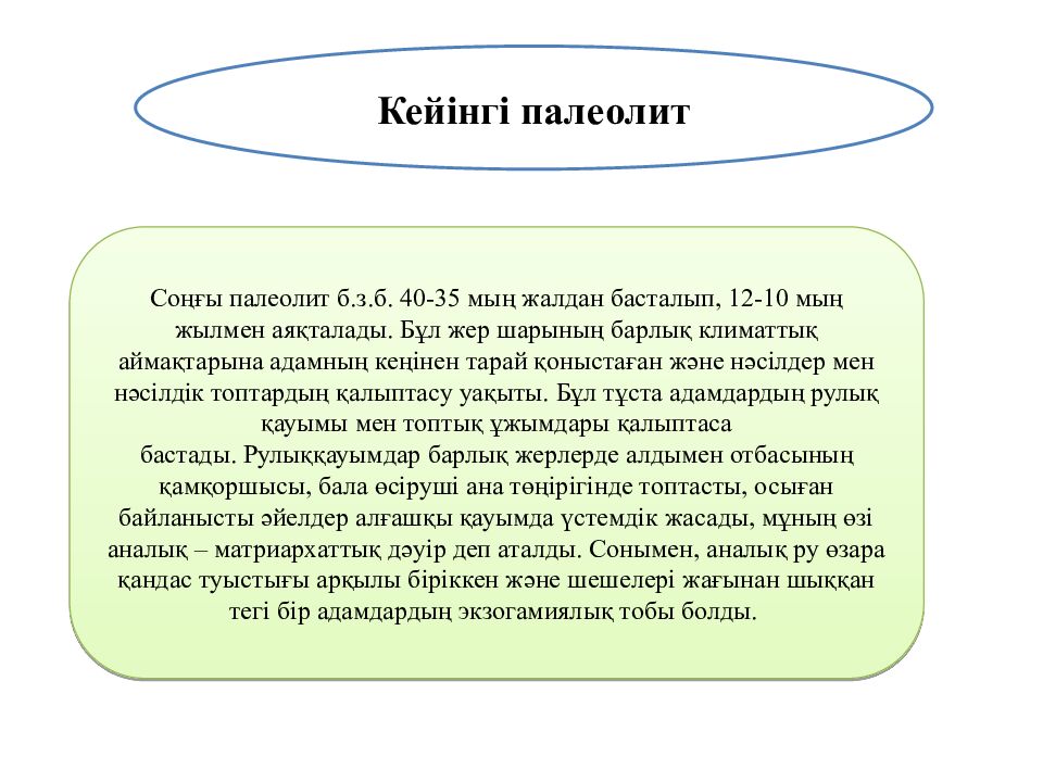 Кейінгі палеолит Соңғы палеолит б.з.б. 40-35 мың жалдан басталып, 12-10 мың жылмен аяқталады. Бұл жер шарының барлық климаттық аймақтарына адамның кеңінен тарай қоныстаған және нәсілдер мен нәсілдік топтардың қалыптасу уақыты. Бұл тұста адамдардың рулық қауымы мен топтық ұжымдары қалыптаса бастады. Рулыққауымдар барлық жерлерде алдымен отбасының қамқоршысы, бала өсіруші ана төңірігінде топтасты, осыған байланысты әйелдер алғашқы қауымда үстемдік жасады, мұның өзі аналық – матриархаттық дәуір деп аталды. Сонымен, аналық ру өзара қандас туыстығы арқылы біріккен және шешелері жағынан шыққан тегі бір адамдардың экзогамиялық тобы болды.