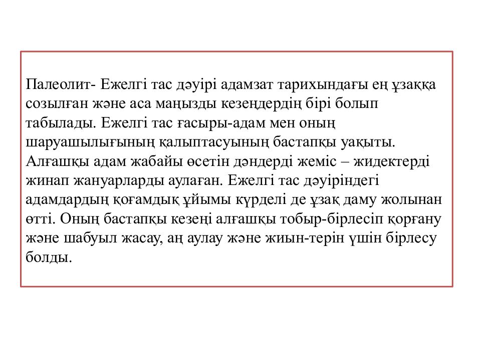 Палеолит- Ежелгі тас дәуірі адамзат тарихындағы ең ұзаққа созылған және аса маңызды кезеңдердің бірі болып табылады. Ежелгі тас ғасыры-адам мен оның шаруашылығының қалыптасуының бастапқы уақыты. Алғашқы адам жабайы өсетін дәндерді жеміс – жидектерді жинап жануарларды аулаған. Ежелгі тас дәуіріндегі адамдардың қоғамдық ұйымы күрделі де ұзақ даму жолынан өтті. Оның бастапқы кезеңі алғашқы тобыр-бірлесіп қорғану және шабуыл жасау, аң аулау және жиын-терін үшін бірлесу болды.