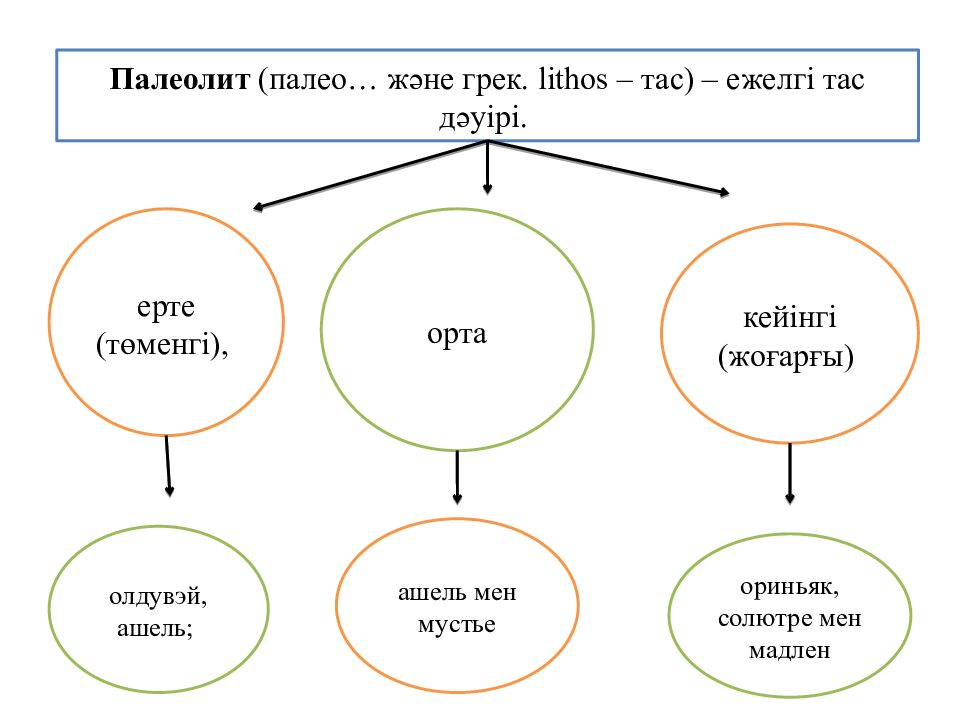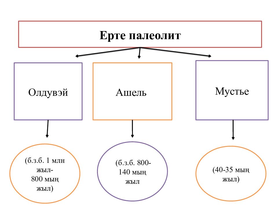 Ерте палеолит Ашель Мустье Олдувэй ( б.з.б. 1 млн жыл-800 мың жыл ) ( б.з.б. 800-140 мың жыл (40-35 мың жыл )