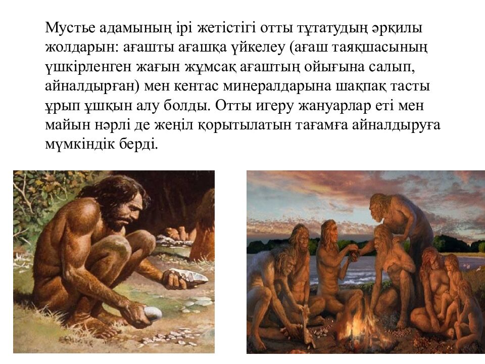 Мустье адамының ірі жетістігі отты тұтатудың әрқилы жолдарын : ағашты ағашқа үйкелеу (ағаш таяқшасының үшкірленген жағын жұмсақ ағаштың ойығына салып, айналдырған ) мен кентас минералдарына шақпақ тасты ұрып ұшқын алу болды. Отты игеру жануарлар еті мен майын нәрлі де жеңіл қорытылатын тағамға айналдыруға мүмкіндік берді.