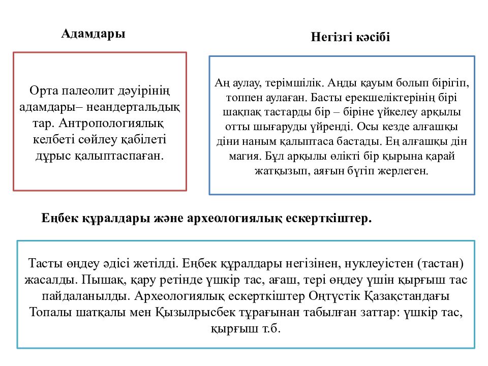 Адамдары Орта палеолит дәуірінің адамдары – неандертальдықтар. Антропологиялық келбеті сөйлеу қабілеті дұрыс қалыптаспаған. Аң аулау, терімшілік. Аңды қауым болып бірігіп, топпен аулаған. Басты ерекшеліктерінің бірі шақпақ тастарды бір – біріне үйкелеу арқылы отты шығаруды үйренді. Осы кезде алғашқы діни наным қалыптаса бастады. Ең алғашқы дін магия. Бұл арқылы өлікті бір қырына қарай жатқызып, аяғын бүгіп жерлеген. Негізгі кәсібі Еңбек құралдары және археологиялық ескерткіштер. Тасты өңдеу әдісі жетілді. Еңбек құралдары негізінен, нуклеуістен ( тастан ) жасалды. Пышақ, қару ретінде үшкір тас, ағаш, тері өңдеу үшін қырғыш тас пайдаланылды. Археологиялық ескерткіштер Оңтүстік Қазақстандағы Топалы шатқалы мен Қызылрысбек тұрағынан табылған заттар : үшкір тас, қырғыш т.б.