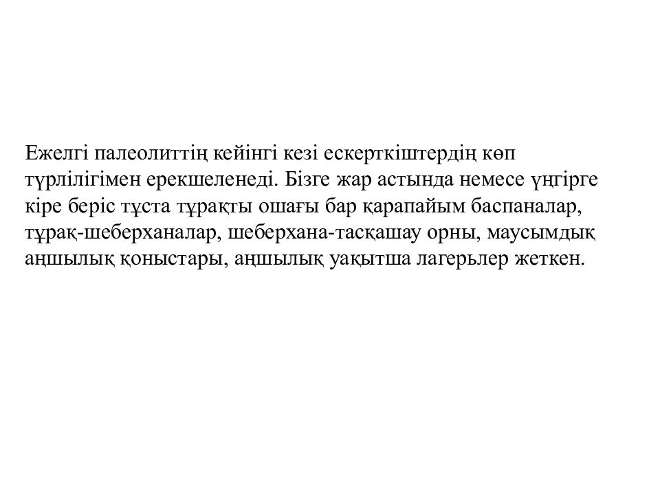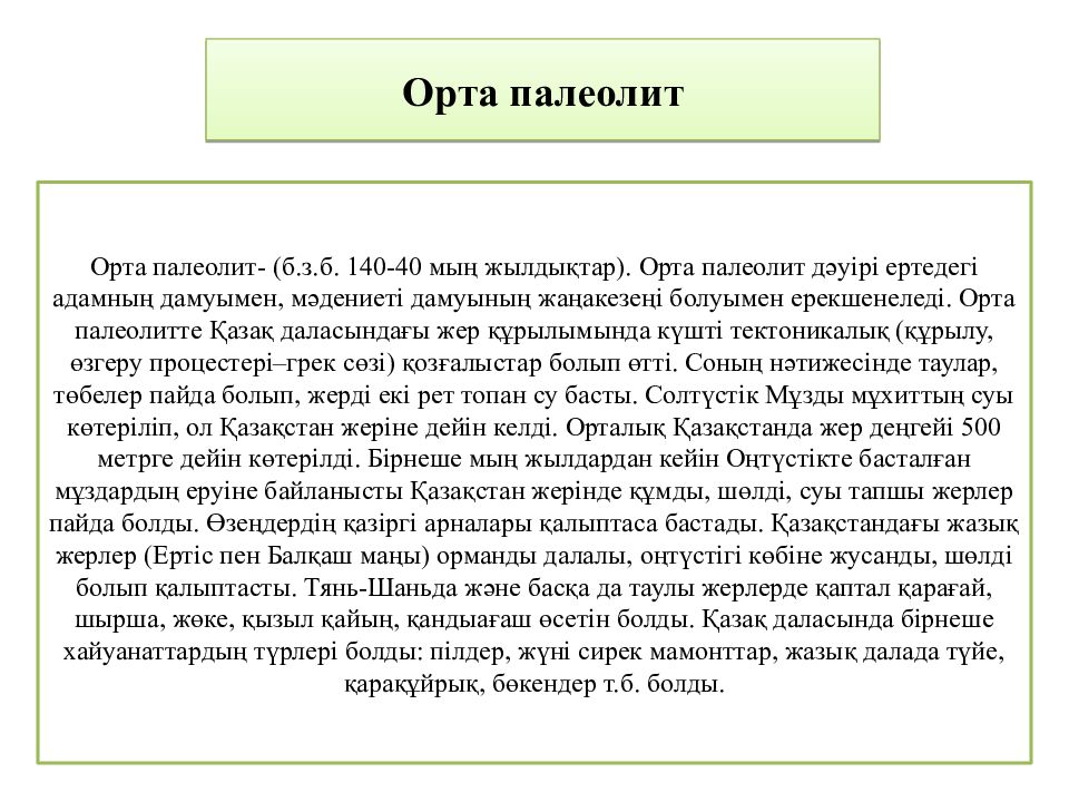 Орта палеолит Орта палеолит- ( б.з.б. 140-40 мың жылдықтар ). Орта палеолит дәуірі ертедегі адамның дамуымен, мәдениеті дамуының жаңакезеңі болуымен ерекшенеледі. Орта палеолитте Қазақ даласындағы жер құрылымында күшті тектоникалық ( құрылу, өзгеру процестері –грек сөзі ) қозғалыстар болып өтті. Соның нәтижесінде таулар, төбелер пайда болып, жерді екі рет топан су басты. Солтүстік Мұзды мұхиттың суы көтеріліп, ол Қазақстан жеріне дейін келді. Орталық Қазақстанда жер деңгейі 500 метрге дейін көтерілді. Бірнеше мың жылдардан кейін Оңтүстікте басталған мұздардың еруіне байланысты Қазақстан жерінде құмды, шөлді, суы тапшы жерлер пайда болды. Өзеңдердің қазіргі арналары қалыптаса бастады. Қазақстандағы жазық жерлер ( Ертіс пен Балқаш маңы ) орманды далалы, оңтүстігі көбіне жусанды, шөлді болып қалыптасты. Тянь-Шаньда және басқа да таулы жерлерде қаптал қарағай, шырша, жөке, қызыл қайың, қандыағаш өсетін болды. Қазақ даласында бірнеше хайуанаттардың түрлері болды : пілдер, жүні сирек мамонттар, жазық далада түйе, қарақұйрық, бөкендер т.б. болды.