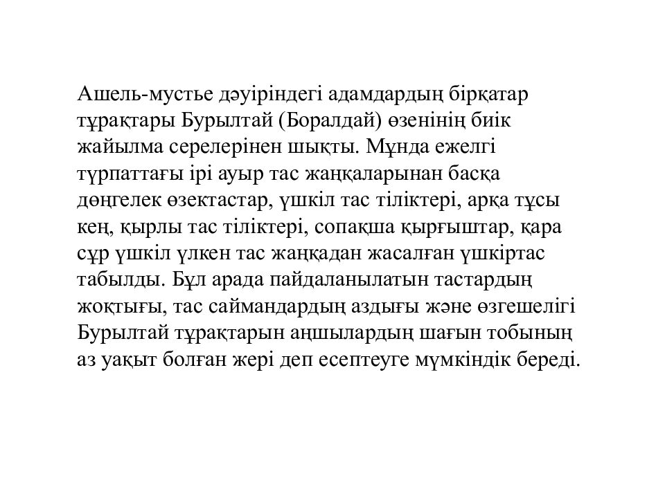 Ашель-мустье дәуіріндегі адамдардың бірқатар тұрақтары Бурылтай (Боралдай) өзенінің биік жайылма серелерінен шықты. Мұнда ежелгі түрпаттағы ірі ауыр тас жаңқаларынан басқа дөңгелек өзектастар, үшкіл тас тіліктері, арқа тұсы кең, қырлы тас тіліктері, сопақша қырғыштар, қара сұр үшкіл үлкен тас жаңқадан жасалған үшкіртас табылды. Бұл арада пайдаланылатын тастардың жоқтығы, тас саймандардың аздығы және өзгешелігі Бурылтай тұрақтарын аңшылардың шағын тобының аз уақыт болған жері деп есептеуге мүмкіндік береді.