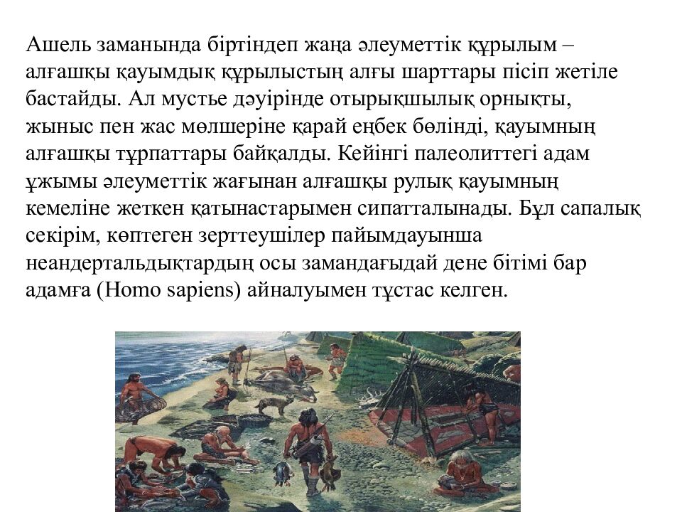 Ашель заманында біртіндеп жаңа әлеуметтік құрылым – алғашқы қауымдық құрылыстың алғы шарттары пісіп жетіле бастайды. Ал мустье дәуірінде отырықшылық орнықты, жыныс пен жас мөлшеріне қарай еңбек бөлінді, қауымның алғашқы тұрпаттары байқалды. Кейінгі палеолиттегі адам ұжымы әлеуметтік жағынан алғашқы рулық қауымның кемеліне жеткен қатынастарымен сипатталынады. Бұл сапалық секірім, көптеген зерттеушілер пайымдауынша неандертальдықтардың осы замандағыдай дене бітімі бар адамға ( Homo sapiens) айналуымен тұстас келген.