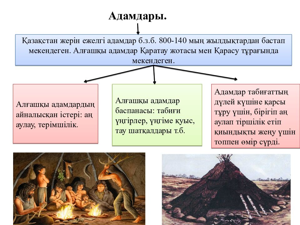 Адамдары. Қазақстан жерін ежелгі адамдар б.з.б. 800-140 мың жылдықтардан бастап мекендеген. Алғашқы адамдар Қаратау жотасы мен Қарасу тұрағында мекендеген. A лғашқы адамдардың айналысқан істері : аң аулау, терімшілік. Алғашқы адамдар баспанасы : табиғи үңгірлер, үңгіме қуыс, тау шатқалдары т.б. Адамдар табиғаттың дүлей күшіне қарсы тұру үшін, бірігіп аң аулап тіршілік етіп қиындықты жеңу үшін топпен өмір сүрді.