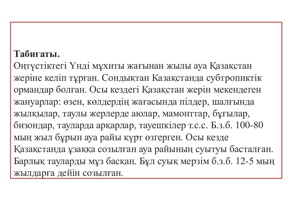 Табиғаты. Оңтүстіктегі Үнді мұхиты жағынан жылы ауа Қазақстан жеріне келіп тұрған. Сондықтан Казақстанда субтропиктік ормандар болған. Осы кездегі Қазақстан жерін мекендеген жануарлар : өзен, көлдердің жағасында пілдер, шалғында жылқылар, таулы жерлерде аюлар, мамонттар, бұғылар, бизондар, тауларда арқарлар, тауешкілер т.с.с. Б.з.б. 100-80 мың жыл бұрын ауа райы қүрт өзгерген. Осы кезде Қазақстанда ұзаққа созылған ауа райының суытуы басталған. Барлық тауларды мұз басқан. Бұл суық мерзім б.з.б. 12-5 мың жылдарға дейін созылған.