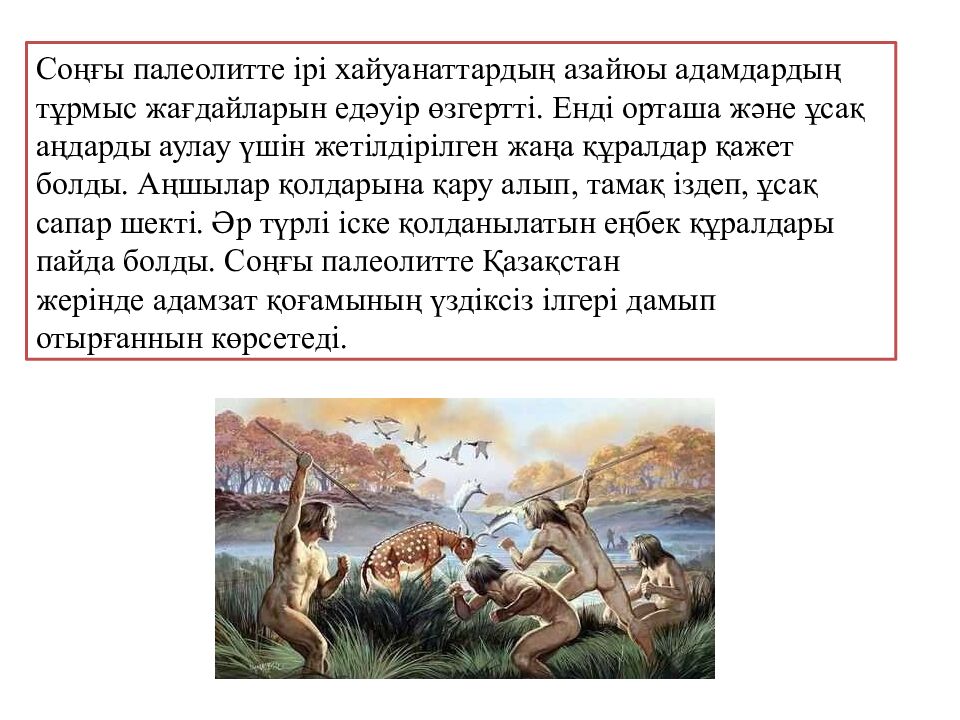 Соңғы палеолитте ірі хайуанаттардың азайюы адамдардың тұрмыс жағдайларын едәуір өзгертті. Енді орташа және ұсақ аңдарды аулау үшін жетілдірілген жаңа құралдар қажет болды. Аңшылар қолдарына қару алып, тамақ іздеп, ұсақ сапар шекті. Әр түрлі іске қолданылатын еңбек құралдары пайда болды. Соңғы палеолитте Қазақстан жерінде адамзат қоғамының үздіксіз ілгері дамып отырғаннын көрсетеді.