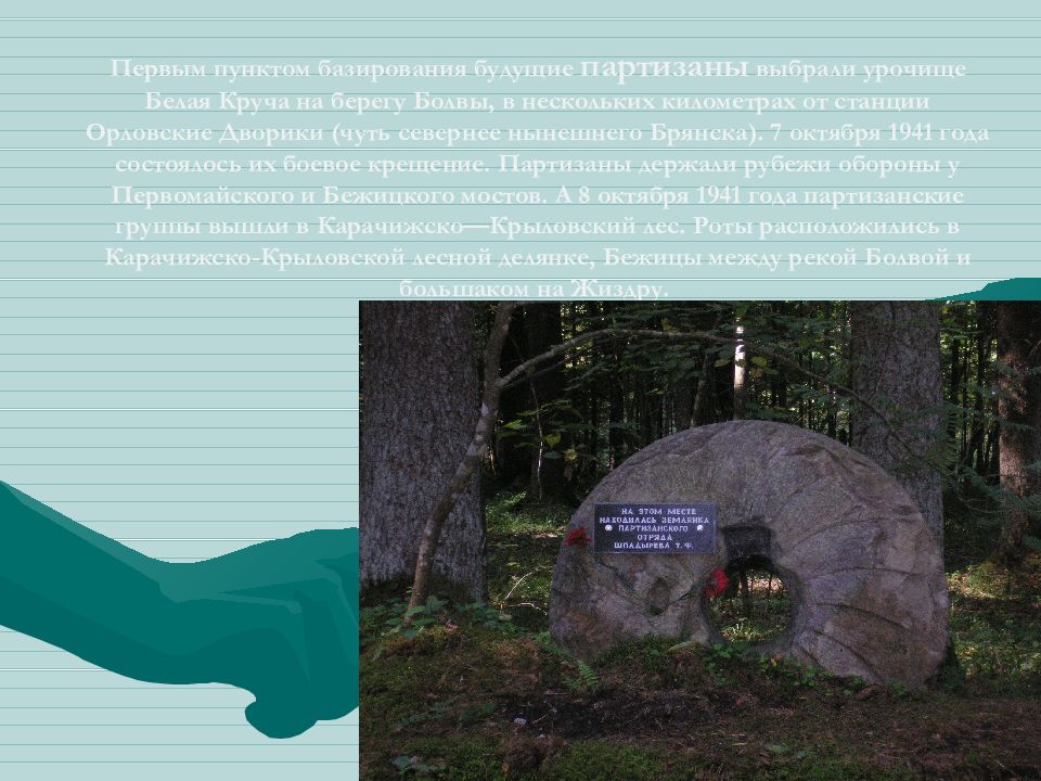 Слайд 10: Первым пунктом базирования будущие партизаны выбрали урочище Белая Круча на берегу Болвы, в нескольких километрах от станции Орловские Дворики (чуть севернее нынешнего Брянска). 7 октября 1941 года состоялось их боевое крещение. Партизаны держали рубежи обороны у Первомайского и Бежицкого мостов. А 8 октября 1941 года партизанские группы вышли в Карачижско — Крыловский лес. Роты расположились в Карачижско-Крыловской лесной делянке, Бежицы между рекой Болвой и большаком на Жиздру