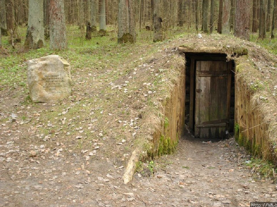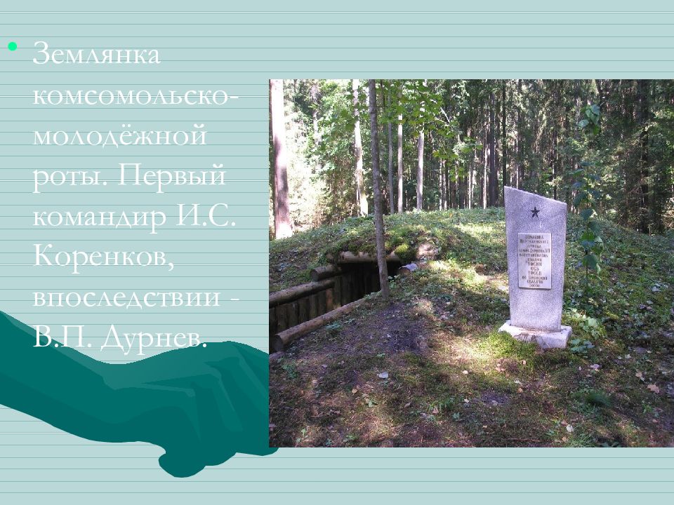 Землянка комсомольско-молодёжной роты. Первый командир И.С. Коренков, впоследствии - В.П. Дурнев.