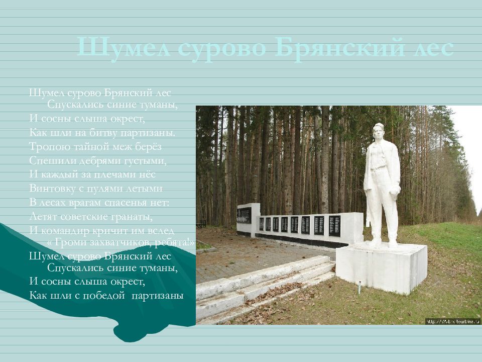 Шумел сурово Брянский лес Спускались синие туманы, И сосны слыша окрест, Как шли на битву партизаны. Тропою тайной меж берёз Спешили дебрями густыми, И каждый за плечами нёс Винтовку с пулями летыми В лесах врагам спасенья нет: Летят советские гранаты, И командир кричит им вслед « Громи захватчиков, ребята!» Шумел сурово Брянский лес Спускались синие туманы, И сосны слыша окрест, Как шли с победой партизаны