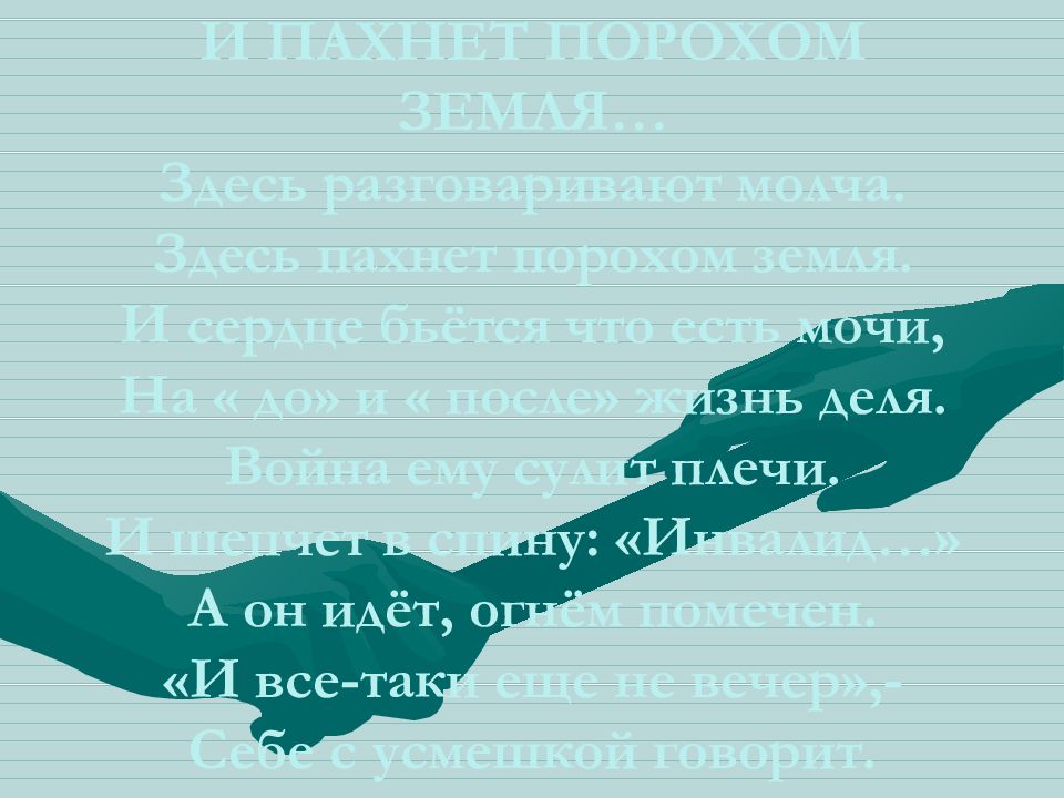 Слайд 24: И ПАХНЕТ ПОРОХОМ ЗЕМЛЯ… Здесь разговаривают молча. Здесь пахнет порохом земля. И сердце бьётся что есть мочи, На « до» и « после» жизнь деля. Война ему сулит плечи. И шепчет в спину: «Инвалид…» А он идёт, огнём помечен. «И все-таки еще не вечер»,- Себе с усмешкой говорит