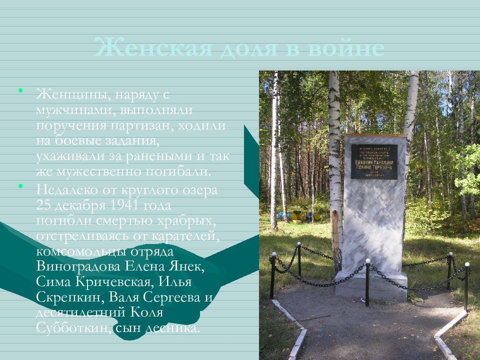 Женщины, наряду с мужчинами, выполняли поручения партизан, ходили на боевые задания, ухаживали за ранеными и так же мужественно погибали. Недалеко от круглого озера 25 декабря 1941 года погибли смертью храбрых, отстреливаясь от карателей, комсомольцы отряда Виноградова Елена Янек, Сима Кричевская, Илья Скрепкин, Валя Сергеева и десятилетний Коля Субботкин, сын лесника.