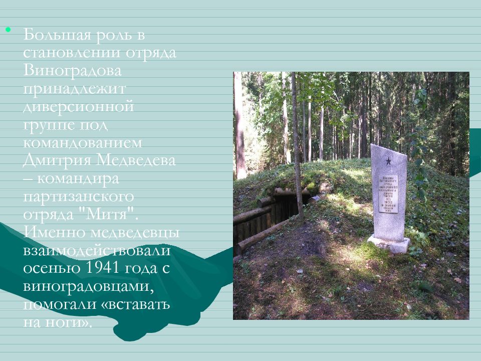 Большая роль в становлении отряда Виноградова принадлежит диверсионной группе под командованием Дмитрия Медведева – командира партизанского отряда "Митя". Именно медведевцы взаимодействовали осенью 1941 года с виноградовцами, помогали «вставать на ноги».