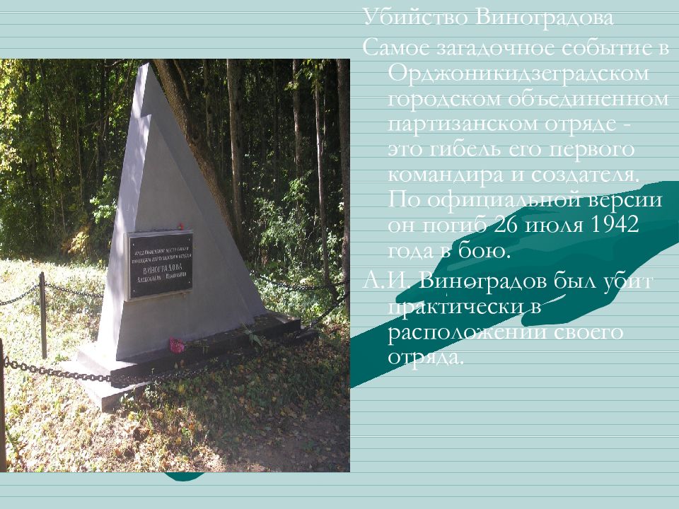 Убийство Виноградова Самое загадочное событие в Орджоникидзеградском городском объединенном партизанском отряде - это гибель его первого командира и создателя. По официальной версии он погиб 26 июля 1942 года в бою. А.И. Виноградов был убит практически в расположении своего отряда.