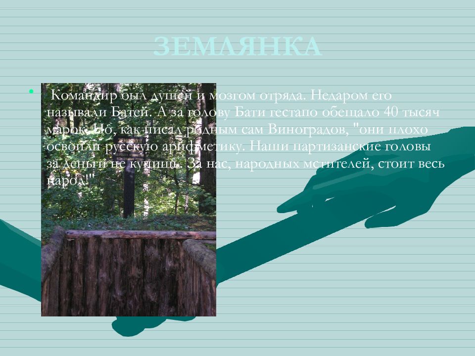 Командир был душей и мозгом отряда. Недаром его называли Батей. А за голову Бати гестапо обещало 40 тысяч марок. Но, как писал родным сам Виноградов, "они плохо освоили русскую арифметику. Наши партизанские головы за деньги не купишь. За нас, народных мстителей, стоит весь народ!"