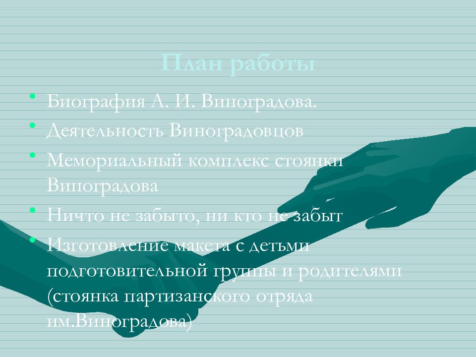 Биография А. И. Виноградова. Деятельность Виноградовцов Мемориальный комплекс стоянки Виноградова Ничто не забыто, ни кто не забыт Изготовление макета с детьми подготовительной группы и родителями (стоянка партизанского отряда им.Виноградова)