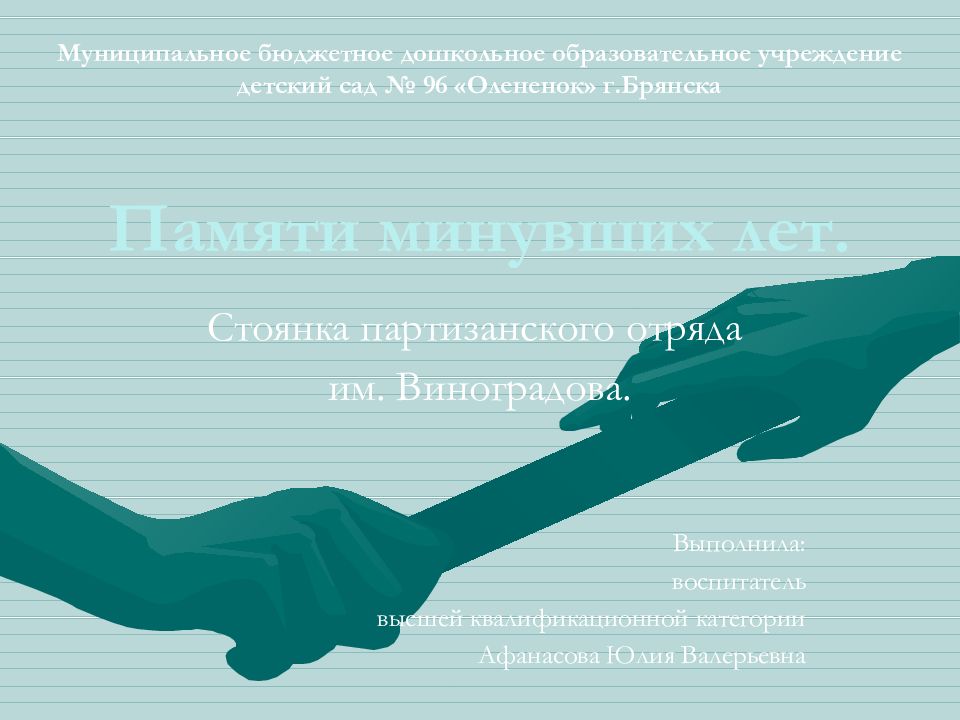 Стоянка партизанского отряда им. Виноградова. Выполнила: воспитатель высшей квалификационной категории Афанасова Юлия Валерьевна Брянск,2025 Муниципальное бюджетное дошкольное образовательное учреждение детский сад № 96 «Олененок» г.Брянска
