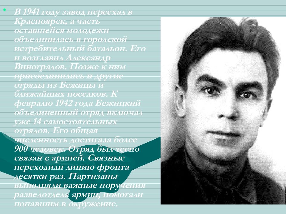 В 1941 году завод переехал в Красноярск, а часть оставшейся молодежи объединилась в городской истребительный батальон. Его и возглавил Александр Виноградов. Позже к ним присоединились и другие отряды из Бежицы и ближайших поселков. К февралю 1942 года Бежицкий объединенный отряд включал уже 14 самостоятельных отрядов. Его общая численность достигала более 900 человек. Отряд был тесно связан с армией. Связные переходили линию фронта десятки раз. Партизаны выполняли важные поручения разведотдела армии, помогали попавшим в окружение.