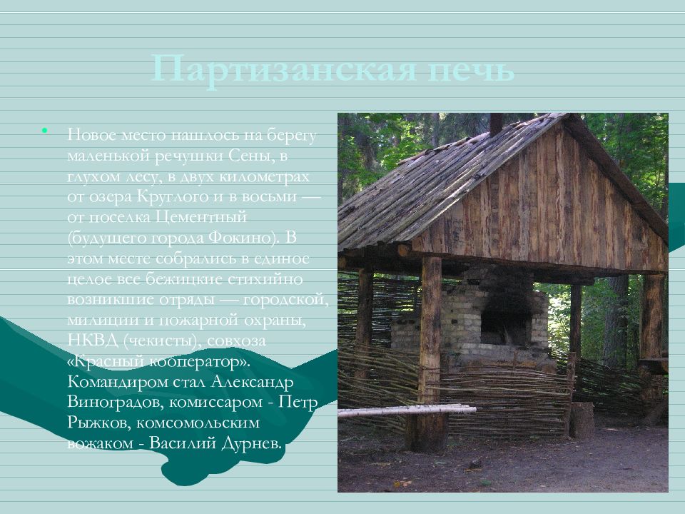 Новое место нашлось на берегу маленькой речушки Сены, в глухом лесу, в двух километрах от озера Круглого и в восьми — от поселка Цементный (будущего города Фокино). В этом месте собрались в единое целое все бежицкие стихийно возникшие отряды — городской, милиции и пожарной охраны, НКВД (чекисты), совхоза «Красный кооператор». Командиром стал Александр Виноградов, комиссаром - Петр Рыжков, комсомольским вожаком - Василий Дурнев.