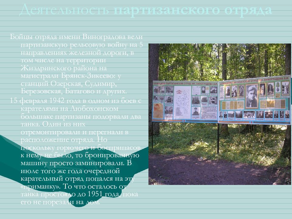 Бойцы отряда имени Виноградова вели партизанскую рельсовую войну на 5 направлениях железной дороги, в том числе на территории Жиздринского района на магистрали Брянск-Зикеево: у станций Озерская, Судимир, Березовская, Батагово и других. 15 февраля 1942 года в одном из боев с карателями на Любохонском большаке партизаны подорвали два танка. Один из них отремонтировали и перегнали в расположение отряда. Но поскольку горючего и боеприпасов к нему не было, то бронированную машину просто заминировали. В июле того же года очередной карательный отряд попался на эту «приманку». То что осталось от танка простояло до 1951 года, пока его не порезали на лом.