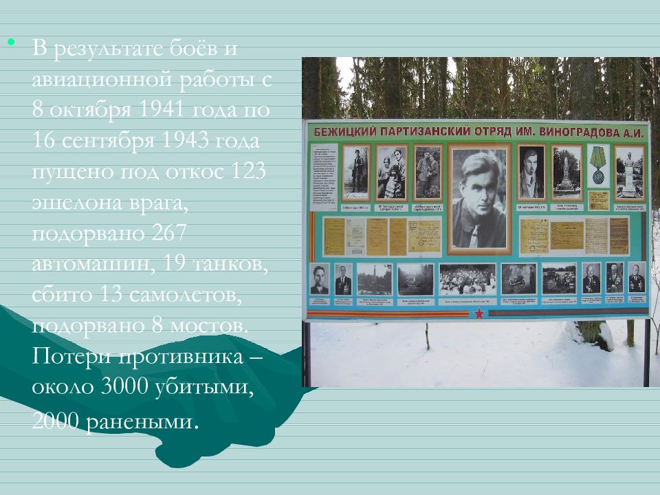 В результате боёв и авиационной работы с 8 октября 1941 года по 16 сентября 1943 года пущено под откос 123 эшелона врага, подорвано 267 автомашин, 19 танков, сбито 13 самолетов, подорвано 8 мостов. Потери противника – около 3000 убитыми, 2000 ранеными.
