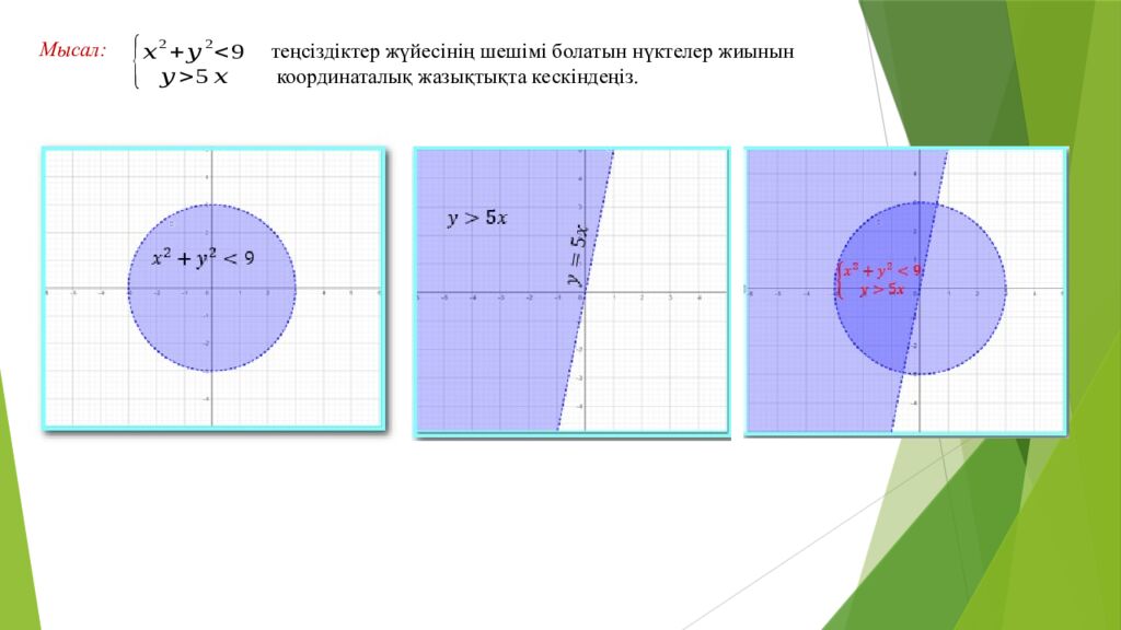 теңсіздіктер жүйесінің шешімі болатын нүктелер жиынын координаталық жазықтықта кескіндеңіз. Мысал: Екі айнымалысы бар сызықтық емес теңсіздіктер жүйесының шешімі координаталық жазықтықта кескінделеді. Ол үшін әрбір теңсіздігінің шешімін бір координаталық жазықтықта кескіндеп, олардың ортақ шешімін табу керек.