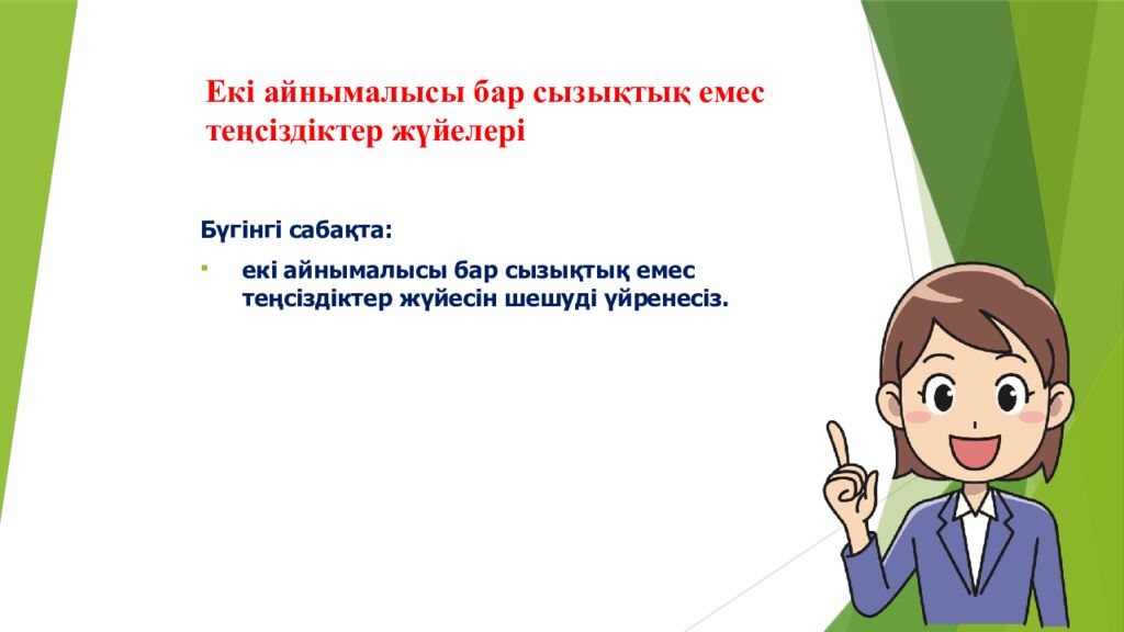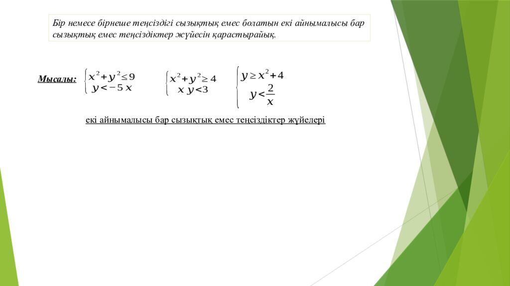Бүгінгі сабақта : екі айнымалысы бар сызықтық емес теңсіздіктер жүйесін шешуді үйренесіз. Екі айнымалысы бар сызықтық емес теңсіздіктер жүйелері